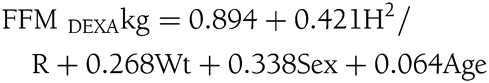 (R2 = 0.857, SEE [standard error of the estimate] = 0.559 kg), where H is height (cm), R is resistance (Ω), Wt is weight (kg), Sex (0 = girls, 1 = boys), and Age (months) (11).